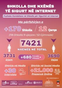E udhëhequr nga ALO 116 me mbështetjen e Bashkimit Europian, CRCA Shqipëri, iSIGURT.al dhe Ministrisë së Arsimit, Fushata Kombëtare “Fëmijë të Sigurt në Internet – në Shkolla të Sigurta” vizitoi 170 shkolla publike anembanë vendit dhe bisedoi me 7400 nxënës dhe mbi 600 mësues e prindër.