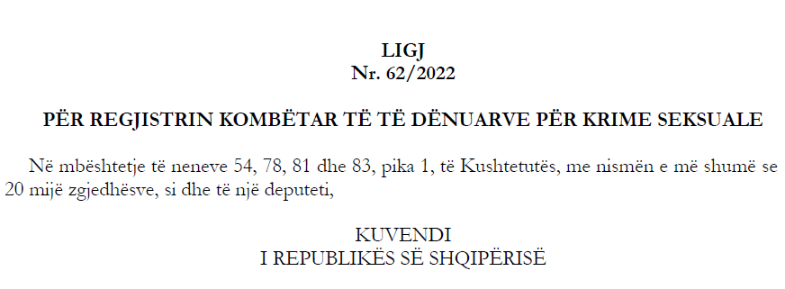 Sipas ligjit, regjistri tashmë përmban të dhëna për të gjithë personat e dënuar me vendim të formës së prerë për vepra seksuale ndaj fëmijëve dhe të rriturve që prej vitit 1992, duke mundësuar verifikimin nga institucionet publike, shkollat, kopshtet, organizatat fetare, ato sportive, institucionet e kujdesit social dhe punëdhënësit publike apo privatë, për të shmangur që personat e dënuar për krime seksuale të kenë qasje në mjedise me fëmijë apo persona të tjerë vulnerabël.